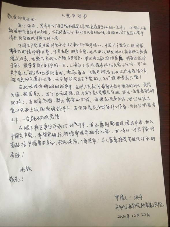 在黑龙江省抗击疫情的最前线,张夺被广大党员同志身先士卒、冲锋一线的身影深深感染,她递交了入党申请书,并向党组织表明抗击疫情的决心和信心:“救死扶伤,不辱使命,本人愿意接受党组织对自己的考验!”支援期间,张夺义无反顾、尽心尽力,发挥护理专业优势,出色地完成了支援救治任务,为护佑黑龙江省人民群众的身体健康和生命安全作出了贡献。深得组织信任的她,在3月20日,作为中共预备党员面向鲜红的党旗庄严宣誓,在抗疫一线光荣地加入中国共产党,张夺说,这是她一生中最值得骄傲和纪念的时刻。