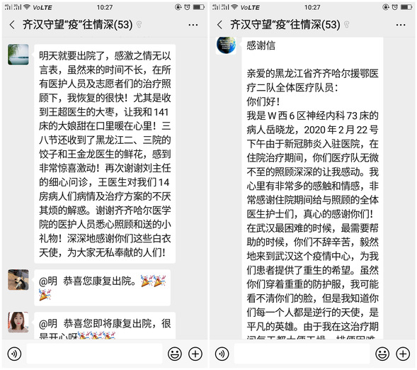 近日,武汉协和医院西院出院患者们不约而同在“齐汉守望‘疫’往情深”医患沟通群里为医疗队点赞。