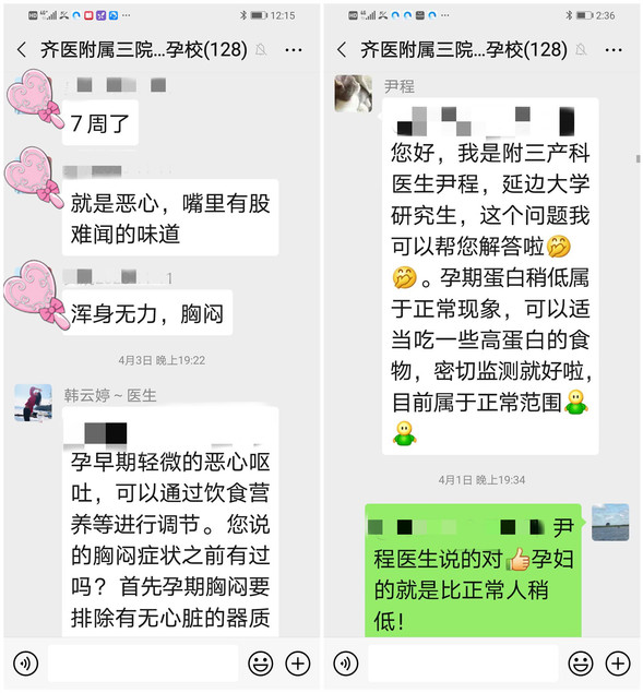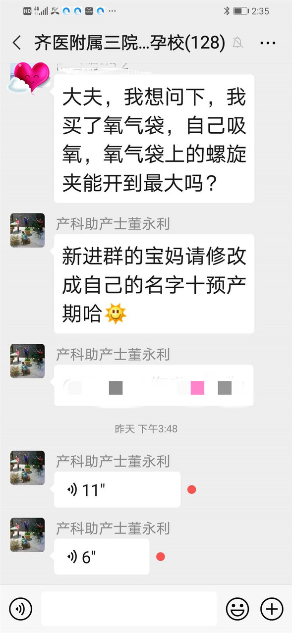 据了解,附属三院产科除开展线上直播课堂外,还通过组建微信群的方式,为孕妈们免费提供长期的健康咨询服务,医护人员在群里轮流解答孕妈们的疑问,进一步优化了患者就医体验,让大家足不出户就能获得产科医生及专家的指导意见。