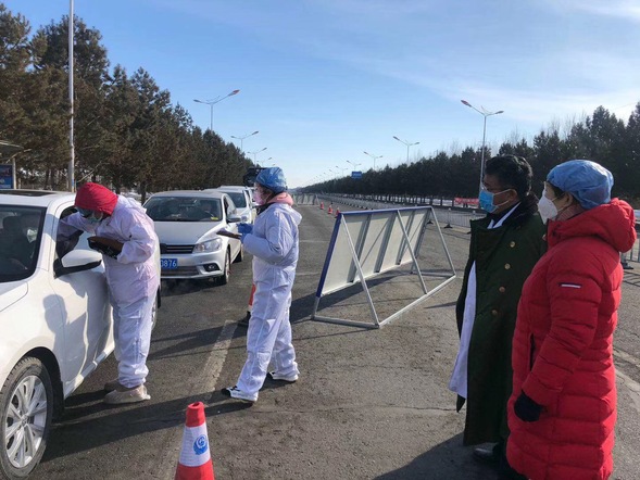 辜振刚(右二)深入齐齐哈尔市入城口防控疫情卡点,慰问工作人员,叮嘱他们在完成好疫情防控值守工作的同时,注意防寒保暖,做好自身防护。