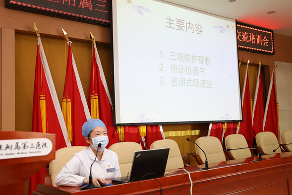 齐姗姗作了题为《抗击新冠肺炎经验分享》,就疫情期间的三级防护级别、俯卧位通气、紧闭式吸痰法及穿脱防护服通过多媒体课件进行了讲解说明。