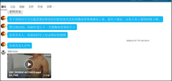 通过反复探索研究,张丹老师最终敲定选用人卫智网+qq群课堂平台及各种小程序的混合式教学模式。第一阶段,在人卫智网平台上组建学生学习的课程,在见习课开课前,学生需要提前到人卫智网完成课程预习。第二阶段,每个班级派代表提前录制查体视频(查体对象为家人),在上课前将录制的视频上传到教师授课平台上。第三阶段,授课老师先带领同学复习理论知识后,集体观看查体视频并点评视频中存在的问题,帮助同学反复强化,以便更好的掌握查体技巧。为了调动学生学习积极性,课程中会使用qq内的各种小程序活跃气氛,结合当前疫情新冠肺炎提出相关查体问题,让学生更好地学会与患者沟通,从而更好地了解病情。第四阶段,通过课堂小测试来检验学生学习效果,及时为学生答疑解惑。第五阶段,课后回访及反思,及时整改存在的问题,以便更好地完成今后的授课,提高授课质量。