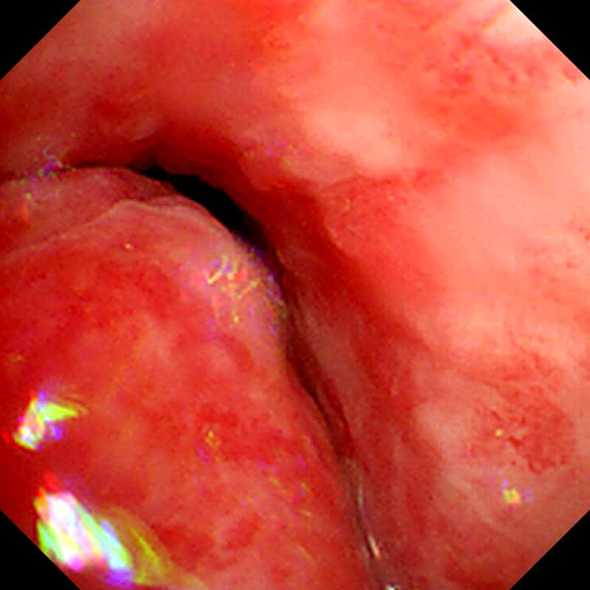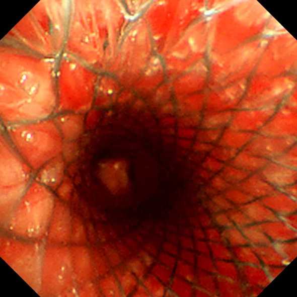 王先生的呼吸困难之所以如此严重是因为肿瘤侵犯气道非常广泛,从气管中上段一直延续到左主支气管,气管的最窄直径只有2毫米,而如此严重的狭窄又导致大量的痰液潴留及反复的肺感染。另外,毗邻食管的气管壁尤为菲薄,随时可能破溃导致气管食管瘘,增加窒息风险。下一步为彻底解决气道梗阻,最佳的方案就是气管支架植入。