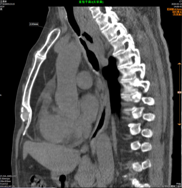 5月22日13:30姜云飞、牟海军在重症医学科医护团队的护航下,腔镜中心副主任护师李晶、护师谭丽丽的配合下,为王先生成功实施了L型镍钛合金气管支架植入术,手术在局麻下进行,全程用时30分钟。术后王先生呼吸困难立即改善,血氧饱和度100%。他兴奋地要求自己走回病房,享受一下久违的顺畅呼吸。5月25日复查支架位置良好,完全覆盖病变,狭窄段彻底通畅,王先生也顺利地转到放疗科继续食管癌的治疗。