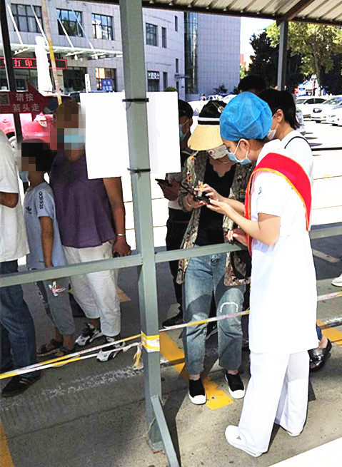 自疫情开始至今,我院门诊预检分诊承担着我院“前哨”工作,随着疫情逐渐向好,门诊前来就诊的患者越来越多。时值酷暑,外面排着长长的患者就医队伍,每天都有志愿者来帮忙,但每周的一、二、三上午的患者还是络绎不绝。当外科第一党支部书记王旭斐听说后,主动与门诊部联系,决定党支部开展系列志愿者服务主题党日活动,各支委密切配合,即刻组织安排科室青年党员和积极分子参加志愿者服务活动,每周一、二都有党员和积极分子服从门诊部安排到门诊院外维护患者扫码工作,帮助预检分诊做一些力所能及的工作。