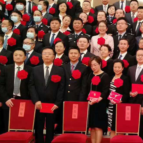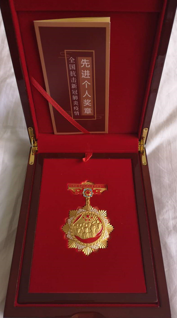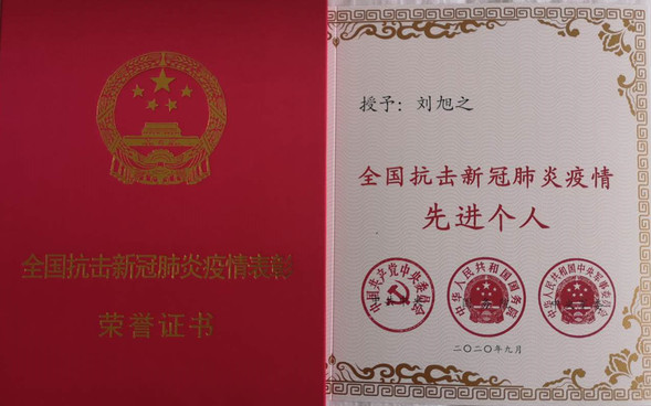刘旭之被授予“全国抗击新冠肺炎疫情先进个人”,图为表彰现场、荣誉证书及奖章