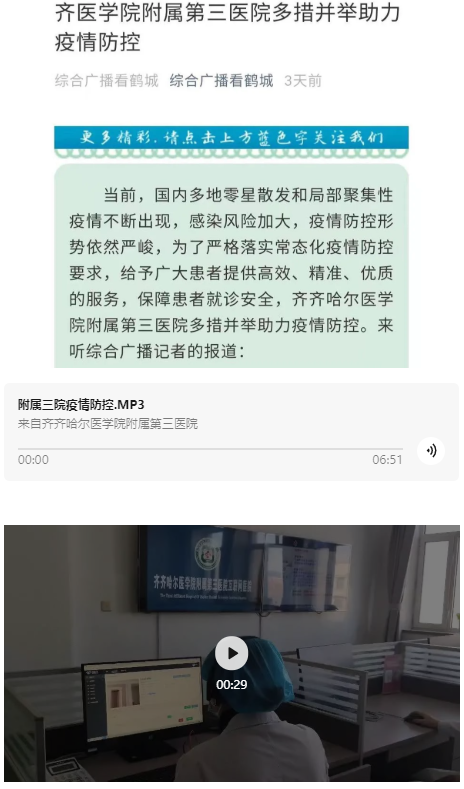1月16日,《综合广播》记者冯洁以《齐医学院附属第三医院多措并举助力疫情防控》为题进行报道
