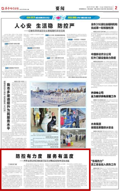 1月18日,《齐齐哈尔日报》记者张颖以《防 控 有 力 度 服 务 有 温 度 —— 齐齐哈尔医学院附属第三医院为市民营造安全就医环境》为题进行报道