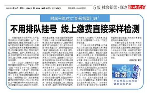 1月18日,《鹤城晚报》记者董野以《附属三院成立“新冠筛查门诊” 不用排队挂号 线上缴费直接采样检测》为题进行报道
