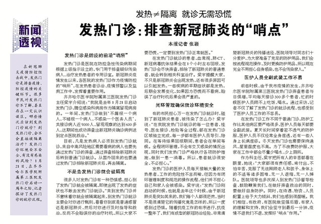 1月31日,《齐齐哈尔日报》以《发热≠隔离 就诊无需恐慌 发热门诊:排查新冠肺炎的“哨点”》为题,对我院发热门诊进行报道。