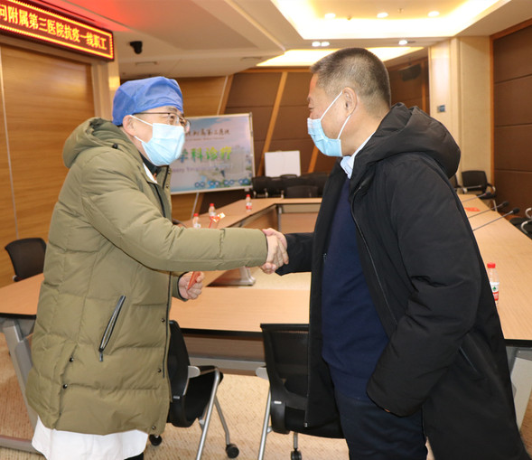 2月4日上午10时,市总工会党组书记、副主席孙义一行5人莅临我院慰问援哈医疗队队员,为他们送来了党和政府的温暖和问候,并向队员们赠送了慰问品。我院党委书记李玉雪出席了慰问活动。