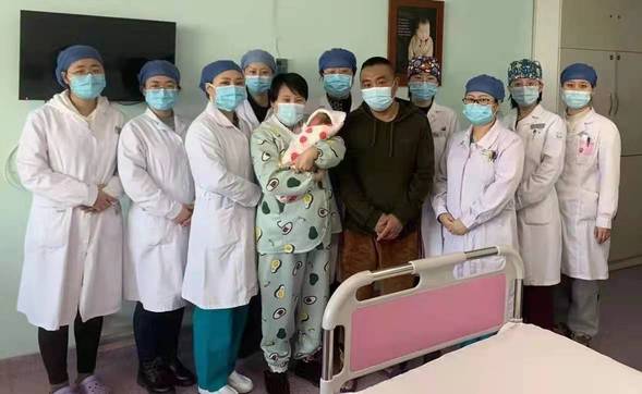 产妇雪艳历经生死考验平安分娩,一家人满怀欣喜与产科医护人员合影留念。