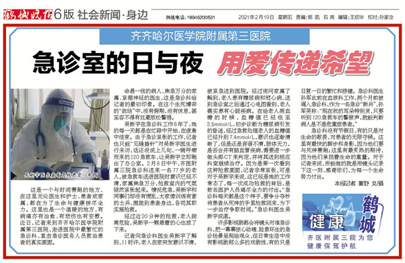2月19日,《鹤城晚报》以《急诊室的日与夜 用爱传递希望》为题,对我院急诊科进行报道。