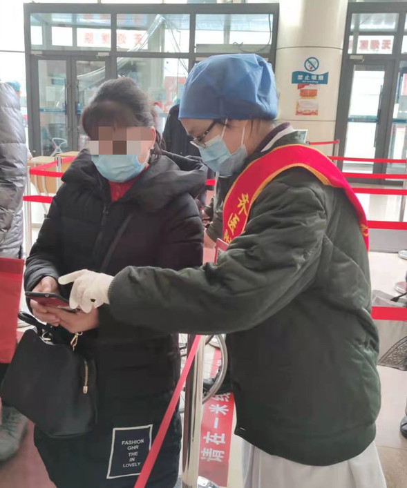 志愿者在预检分诊点指导患者手机预约挂号、填写新冠调查问卷