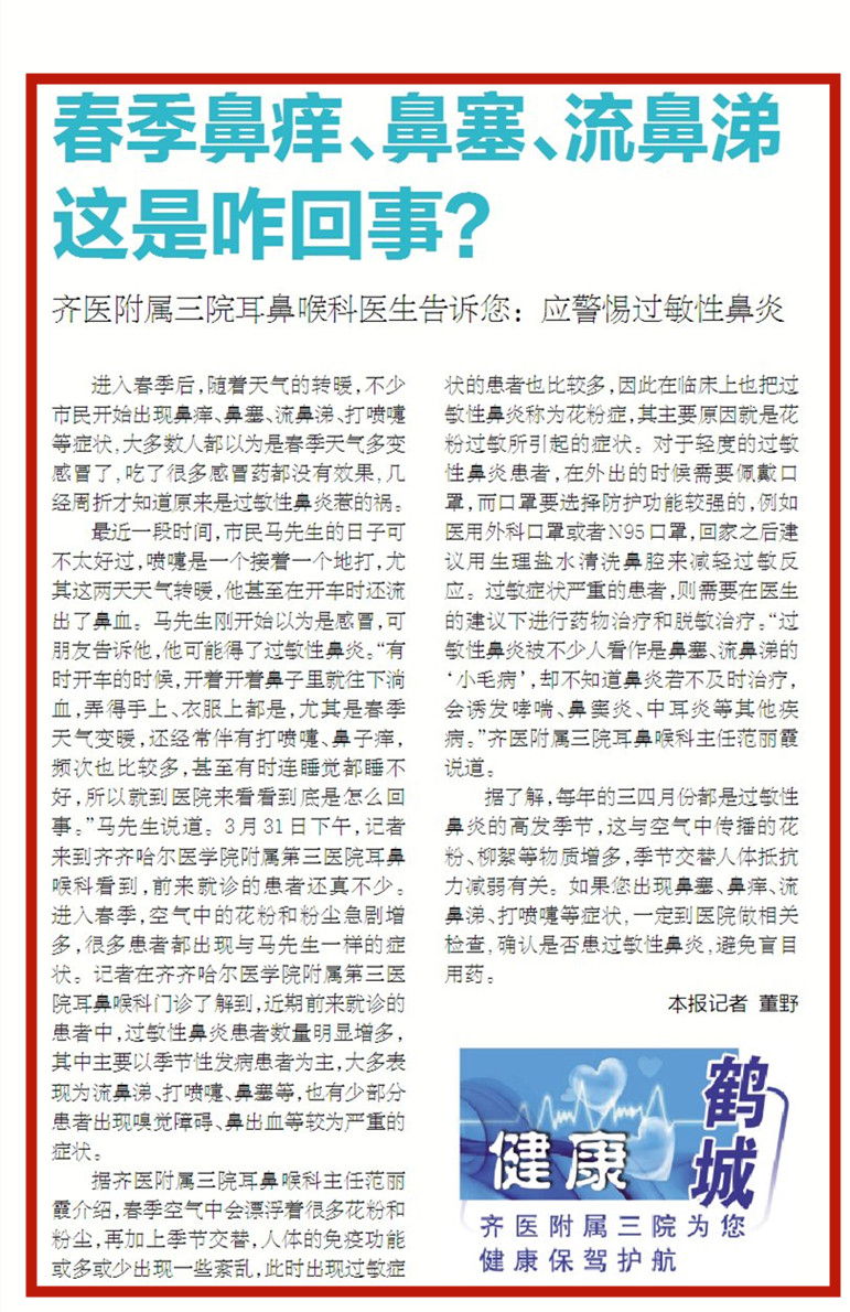 近日,《鹤城晚报》以《春季鼻痒、鼻塞、流鼻涕这是咋回事?齐医附属三院耳鼻喉科医生告诉您:应警惕过敏性鼻炎》为题对我院耳鼻喉科专家进行采访报道。