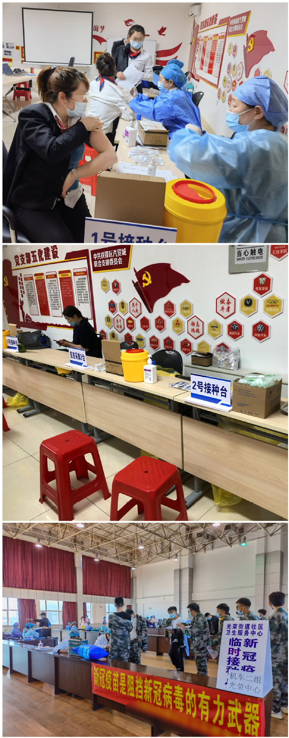 新冠疫苗接种是常态化疫情防控形势下建立全民免疫屏障、阻断疫情传播的重要手段,是“外防输入、内防反弹”的必要举措。优化疫苗接种服务工作,是践行为民服务宗旨,开展“我为群众办实事”活动的一个缩影。我院将疫苗接种工作作为当前疫情防控工作的首要任务来抓,把做好疫苗接种工作作为党史学习教育成效的“试金石”,用实际行动践行初心和使命,筑牢疫情防线。截止目前,我院共选派306名护士,前往车辆厂、铁路系统、民政局近20余家单位,共接种13153人次,均无严重不良反应发生。