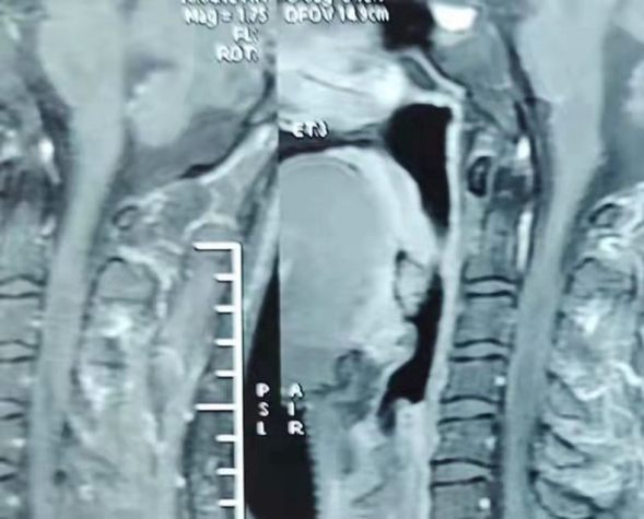 术前经脊髓组陈大刚副主任医师及科室内医师细致分析及讨论,详尽制定了经颈后正中入路颈髓肿瘤切除手术方案及风险预案。于8月9日在手术室、麻醉科及病理室配合下顺利实施手术并镜下全切肿瘤。术中冰冻病理回报为星形细胞瘤2级。术后患者意识恢复,顺利拔除气管插管,患者无呼吸抑制、无肢体瘫痪、无运动感觉障碍、无二便障碍等不良反应,目前患者生命体征平稳恢复中,已经离床活动。