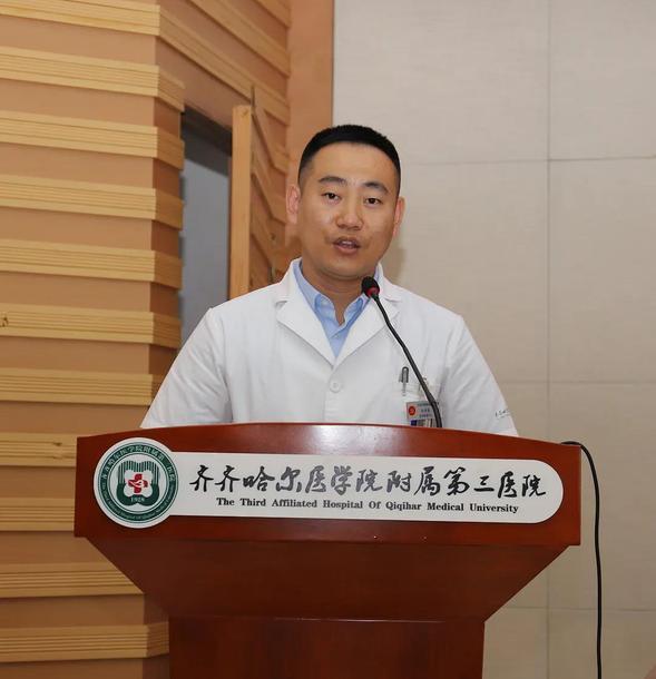 教师代表影像教研室孙学佳发言。他回顾了自身教学的心路历程,用“四个感谢”表达了对医院、领导、同事和学生们的感激之情。他表示,作为医院的一名医务工作者、医学教师,他定会不忘初心、牢记使命,爱岗爱院,用聪明才智和工作激情,续写附属三院更加美好的明天。