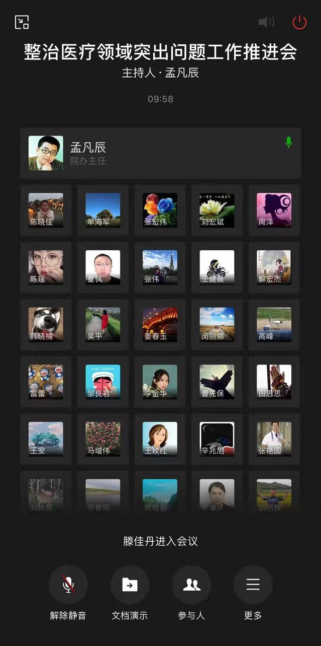 为深入贯彻落实国家九部委《2021年纠正医药购销领域和医疗服务中不正之风工作要点》、中共黑龙江省纪委办公厅《省监委机关贯彻落实省人大常委会审议意见的责任分工方案》和《省卫生健康委、省中医药管理局关于印发<整治医疗领域突出问题工作方案> 的通知》要求,以我省医疗领域突出问题为导向对标对表开展整治工作,紧密结合党史学习教育实际,营造我院医疗领域风清气正良好生态环境,9月15日下午,我院通过腾讯会议召开整治医疗领域突出问题工作线上推进会,我院领导班子和全体中层干部参会。会议由办公室主任孟凡辰主持。