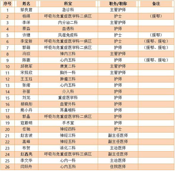 在接到黑龙江省卫生健康委员会下发的《关于紧急抽调医护人员支援哈尔滨市疫情防控工作的函》后,我院领导高度重视、周密部署,迅速抽调人员、组建队伍。各科室通力配合,后勤保障工作落实到位,为每位队员准备了充足的食物、水、消毒及生活用品。不到2小时的时间内,由6名医生、20名护士组成的医疗队集结完毕,其中党员7名,是一支技术过硬、敢打敢拼、战斗力强的精英队伍。他们中不乏支援武汉、哈尔滨抗疫医疗队队员的身影。在接到紧急通知后,有的人刚下夜班还未休息,有的还没来得及和家人告别,就要投入到新的工作战场,充分展现了附三人敢于担当、不惧风险的精神品格。