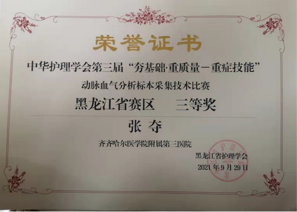 我院张夺荣获中华护理学会第三届“夯基础·重质量—重症技能”动脉血气分析标本采集技术比赛黑龙江省赛区三等奖