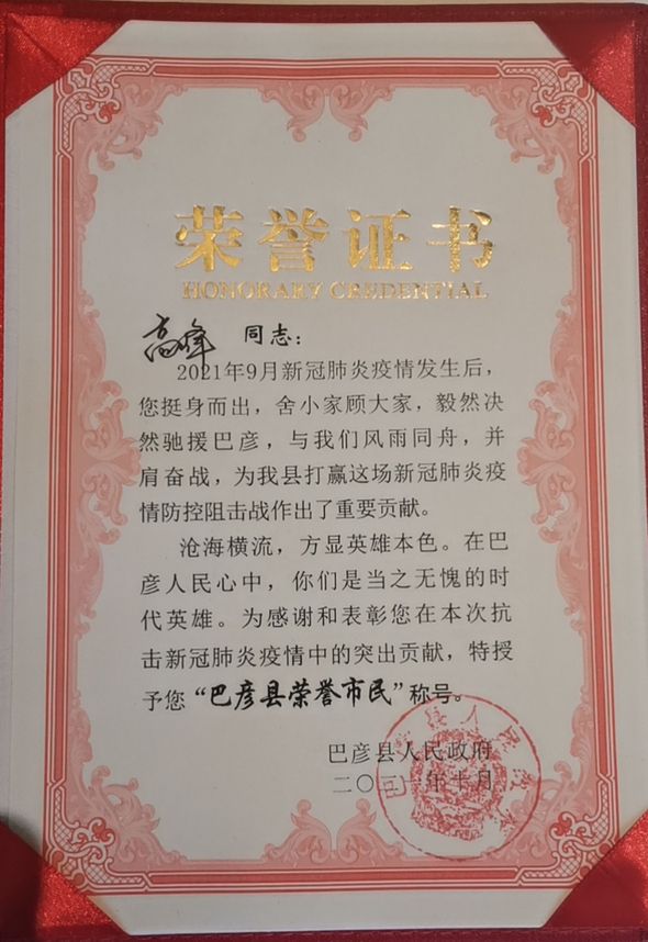 一份耕耘,一份收获。工作期间,发生了许多令我们感动的事情和美好的回忆。有小朋友向我们行队礼,为我们跳支舞;有宾馆的老板娘为我们包饺子,临走时还为我们每位队员赠送了一大束鲜花;有隔离点工作人员赠送的锦旗;有社区写给我们队员的表扬信;有巴彦县人民政府授予我们“巴彦县荣誉市民”荣誉称号;有疫情指挥部写给我们的感谢信……真的,太多的感动,他们曾写道,“你们挺身而出,舍小家顾大家,毅然决然的驰援巴彦与我们风雨同舟、并肩作战,你们是当之无愧的时代英雄”。我也曾回复道,“感谢你们给予我们队员在生活上和工作中的支持和帮助,抗击疫情是我们医务工作者义不容辞的责任,战胜疫情也是对我们最好的褒奖”,真的很感动。