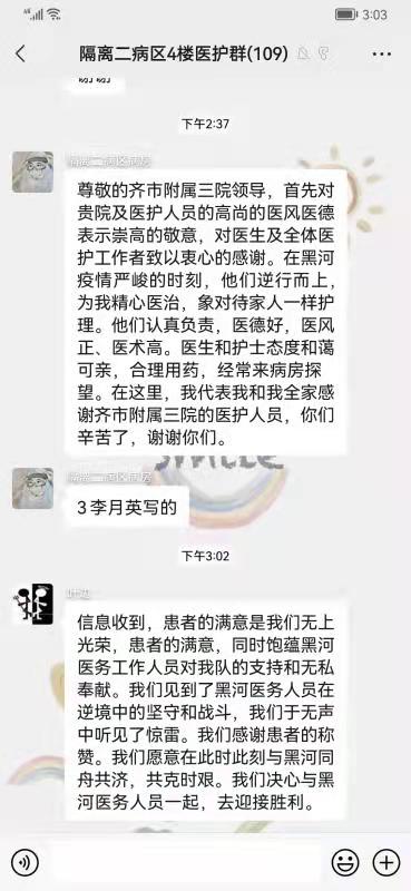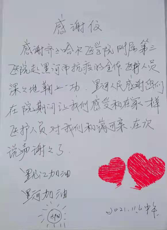 感谢齐齐哈尔医学院附属第三医院赴黑河市抗疫的全体医护人员。深深地鞠上一躬,黑河人民感谢您们在院期间让我们感受和在家一样。医护人员对我们和蔼可亲,再次说声谢谢了。