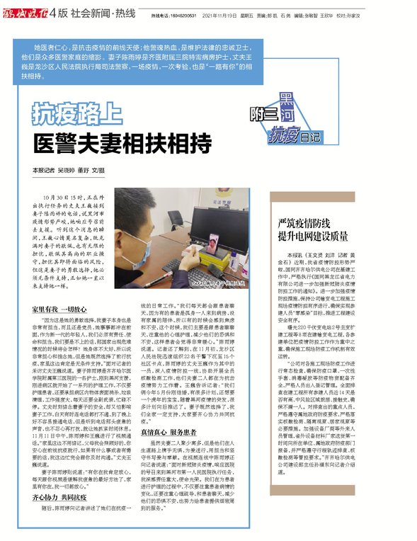 11月19日,《鹤城晚报》记者对我院支援黑河抗疫医疗队队员陈雨婷进行了视频连线采访,请看报道。