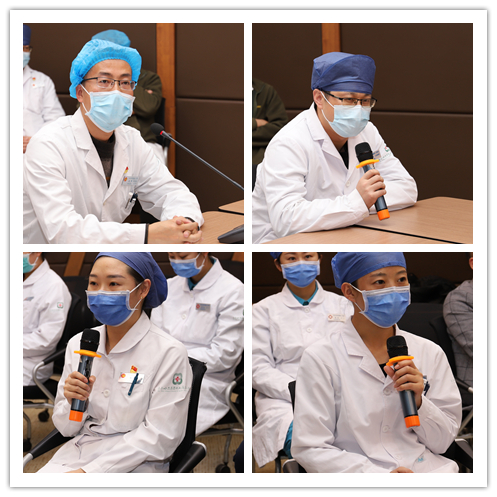 在发言中,医疗队员们对学院及医院领导的关心关爱,以及医院干部职工的支持和帮助表示感谢。他们纷纷表示,抗击疫情、救死扶伤是职责所在,一线抗疫的工作经历是一笔宝贵的财富,他们将认真总结和完善在抗疫期间积累的宝贵经验,继续弘扬伟大抗疫精神,以更加充足的干劲和昂扬的斗志投入到今后的工作中,不遗余力为医院高质量发展贡献力量。只要党和人民有需要,他们将以生命担使命,随时准备出发,奔赴抗疫最前线。
