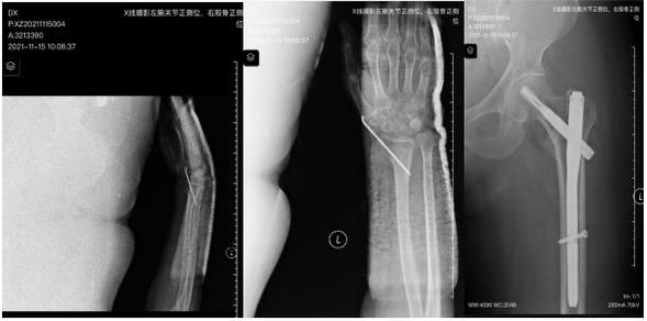 患者高血压病史3年,曾有胸壁结核病史。骨外三科医生考虑该患者高龄,老年髋部骨折卧床时间长、并发症多等问题,经讨论决定早期为患者进行手术治疗,但考虑老年患者多处骨折切开复位损伤较大,出血较多,术后患者恢复慢,甚至出现因手术创伤导致患者其他一些应激性疾病发生,最终经科室医生与骨外三科主任桑梓英讨论后拟行闭合复位内固定术,与患者家属沟通后,家属同意该手术治疗方案。11月12日,行手术治疗,手术过程顺利,左腕部无切口,左髋部切口长约4cm,该病人两处骨折分别予以闭合复位微创固定,未选择切开复位固定,闭合复位固定技术可以让病人早期活动,缩短住院日,该患者术后5天即出院,减轻了患者的经济负担,使患者得到快速恢复,符合快速康复理念(ERAS)。