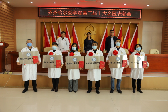 会议首先由医院管理处处长李春旭宣读《关于命名表彰第三届齐齐哈尔医学院名医的决定》,授予我院辜振刚 、鲁珅 、邵海峰、刘琳、温丽娟、 姜岩6位专家“第三届齐齐哈尔医学院名医”荣誉称号。随后,与会领导为获奖名医颁发名医工作室奖牌及证书。