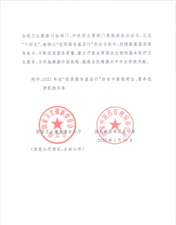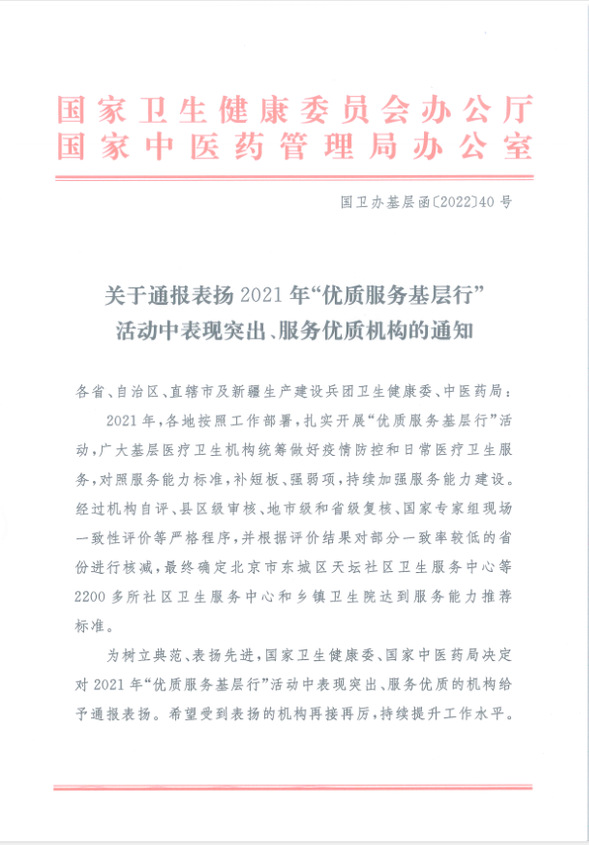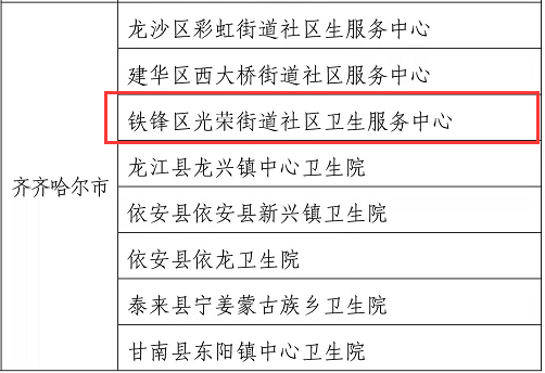 近日,国家卫生健康委办公厅和国家中医药局办公室联合发布《关于通报表扬2021年“优质服务基层行”活动中表现突出、服务优质机构的通知》,光荣街道社区卫生服务中心经过自评、区级审核、市级及省级复核、国家专家组一致性评价等严格程序,达到国家服务能力推荐标准,获得了通报表扬。齐齐哈尔市共有18家社区卫生服务中心位列其中,铁锋区仅光荣街道社区卫生服务中心获此殊荣。