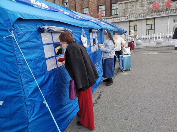 15日7时,带队护士长带领队员到达火车站出站口广场临时搭建的核酸采样点,快速交接工作后,立即开展工作。采集点日间开放8个窗口,夜间开放3个窗口。带队护士长按照现场环境、人员流动路线、规范流程,安排采样人员与工作人员对接,迅速投入到核酸采集的紧张工作中。每个核酸采样点由2名核酸采集队员组成,开设2个窗口;右侧窗口由1名队员负责旅客信息采集,左侧窗口1名队员负责核酸样本采集,2名队员配合默契,核酸采集操作规范,动作轻柔,采集完成后由工作人员指引旅客有序离开车站,缩短旅客等待核酸采集时间,避免人员聚集。为了使旅客在手机端尽快查询到核酸检测结果,采集标本分4个时段由转运箱送回我院检验科进行核酸检测。