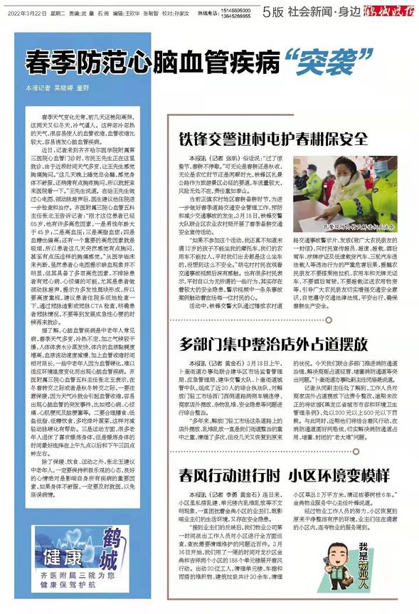 据了解,心脑血管疾病是中老年人常见病,春季天气多变,冷热不定,加之气候较干燥,人体体表水分蒸发快,体内的血液黏稠度增高,血液流动速度减慢,加上血管收缩时间相对延长,一些中老年人因为血管硬化,难以适应环境温度变化而出现心脑血管疾病。齐医附属三院心血管五科主任张北玉表示,在冬春转交之际或者是秋冬转交之际,一要注意保暖,因为天气冷就会引起血管收缩,容易出现心脑血管的突发事件,比如冠心病、心绞痛、心肌梗死及脑梗塞等。二要合理膳食、低盐低脂、低糖饮食,多吃绿叶蔬菜,这样对减轻动脉硬化有帮助。三是运动方面,很多老年人退休了喜欢锻炼身体,但是锻炼身体的时间最好选择在上午九点以后和下午三四点钟左右。