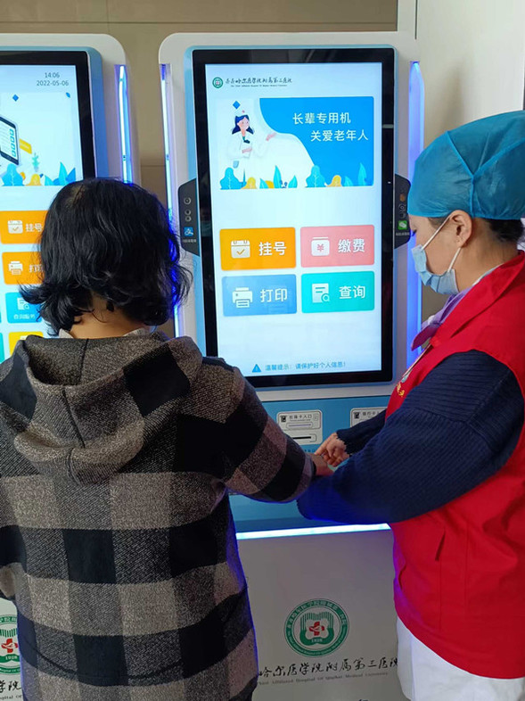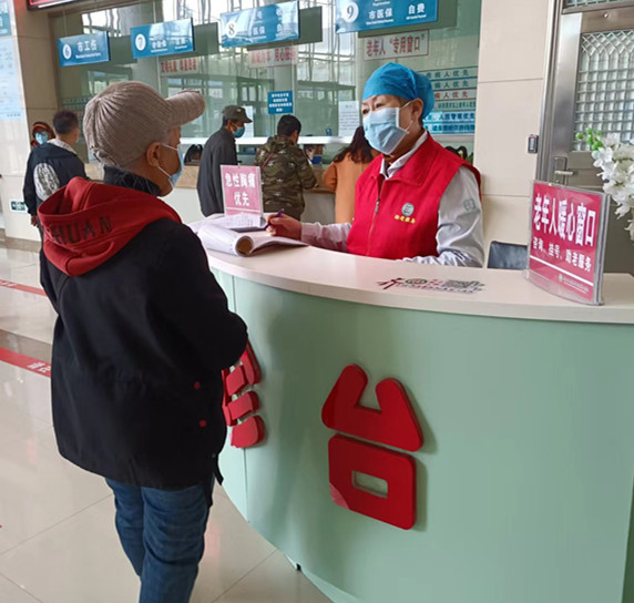 我院自启动“暖阳”助老服务活动以来,设立了一站式助老服务,专门为老年人提供服务,为不会预约挂号的老年人、不会使用自助机的老年人,志愿者进行手把手教;为无手机的老年人,预检分诊开设了“老年人无健康码”通道;我院还在门诊综合楼一楼设立了“暖心服务台”,有专职人员为老年人挂号、咨询等助老服务;在医院门诊每层楼都有穿“红色衣服暖阳助老”的工作人员,帮助老年人解决在就医过程中遇到的困难;医院还专门配备了“长辈自助机”,此自助机的特点就是运行速度慢、屏幕字体大,适合老年人操作。