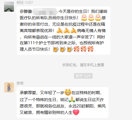 5月5日,我们从哈尔滨回到齐齐哈尔,现在已经第七天了。我很荣幸成为医疗队在龙沙隔离点的负责人,虽然这几天遇到了很多棘手的事,但我的战友们非常配合和支持我的工作。昨天是我的生日,各位领导和队员贴心地一大早为我发来生日祝福,在院里忙碌的领导和同事也发来了祝福视频。在这个特殊的时期,为我过了一个特别的生日,我将永远铭记在心!