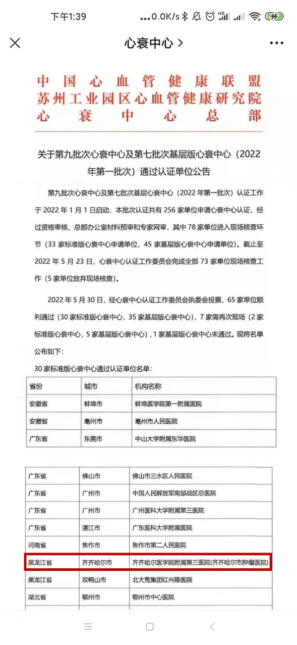 5月30日,心血管健康联盟、苏州工业园区心血管健康研究院、心衰中心总部发布公告,公布了第九批次心衰中心及第七批次基层版心衰中心(2022年第一批次)通过认证单位公告,我院心衰中心顺利通过国家级标准版心衰中心认证。齐齐哈尔市只此一家标准版心衰中心。这不仅标志着我院心衰中心诊疗技术、整合能力、管理体系已达到国家级标准和水平,体现了我院心衰规范化诊治内涵质量跃上了新高度,更彰显了我院心血管内科学科建设取得了里程碑式的进步。