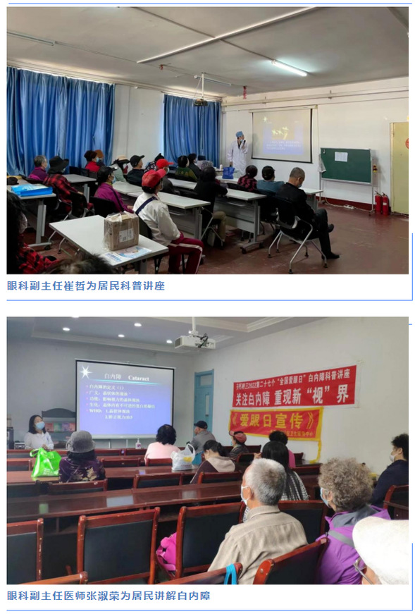 6月6日,我院眼科专家分别在光荣街道社区卫生服务中心和站前街道社区卫生服务中心社区举办白内障知识讲座,眼科专家从产生白内障的原因、治疗和预防等方面对居民进展详细的讲解,讲座互动频繁,讲授知识通俗易懂,受到了居民的高度赞扬。