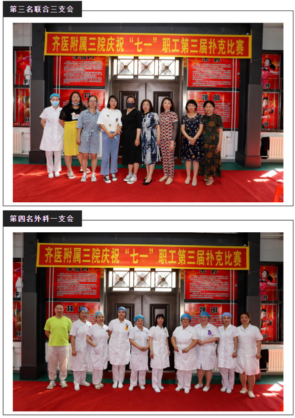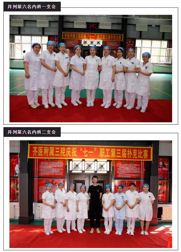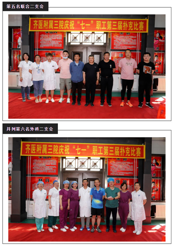 比赛现场火爆热烈,比赛过程紧张激烈,跌宕起伏。参赛队员充分发挥团队精神,密切配合,沉着应战,展开牌技和智慧的角逐。最终通过28场比赛,门诊支会获团体第一名,联合一支会、联合三支会、外科一支会和联合二支会分获第二、第三、第四和第五名;内科一支会、内科二支会和外科二支会并列获得第六名。本届比赛评选出两个最佳三人组合(胜率最高)分别是:联合一支会的王丽、崔鑫;门诊支会的杨钰、奚永强、史良。最后,院领导班子联队与本届比赛获得第一名的门诊支会代表队进行了挑战赛,比赛结果:院领导班子联队获得此次挑战赛的胜利,同时也宣布我院庆“七·一”第三届职工扑克比赛圆满结束。