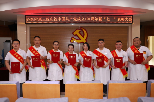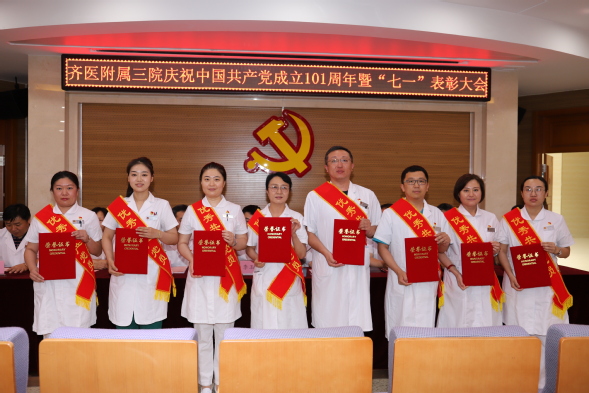 口腔医学院党总支书记、我院党委委员齐占朋同志宣读《中共齐齐哈尔医学院附属第三医院委员会关于2021-2022学年度先优表彰的决定》。党委领导班子成员为受到表彰的集体及个人颁奖。