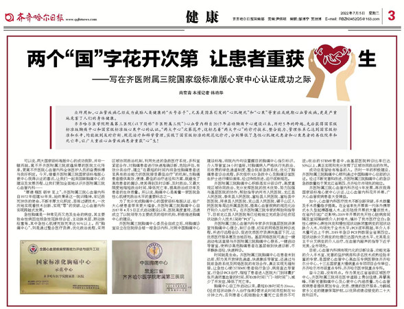 齐医附属三院心血管内科历经五年发展,再次获得国家级标准心衰中心认证,让心血管内科花开并蒂,广大心血管疾病患者大受裨益。
