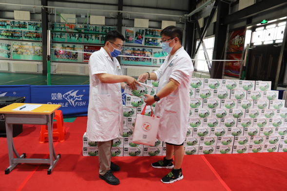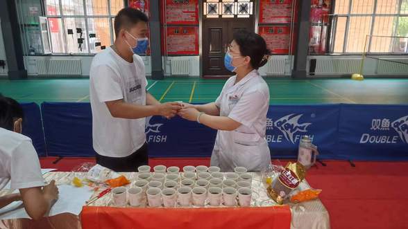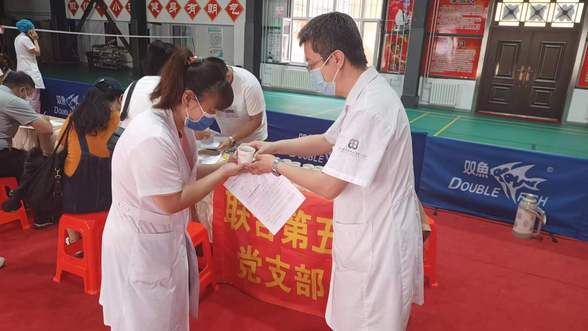 活动前期,联合第五党支部在支部书记苍春阳的带领下,提前来到体育馆布置会场,还自购红糖,在活动当天提前准备好红糖水,发给献血的同志。