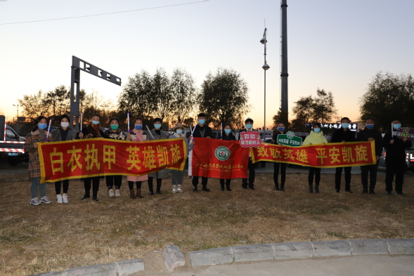 我院领导班子成员、干部职工及队员家属在集中隔离酒店前迎接勇士们凯旋