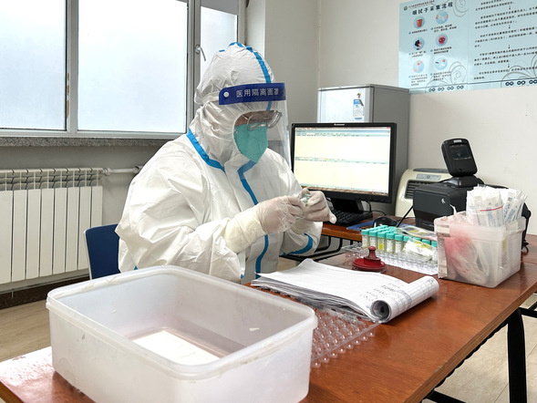 急诊核酸采样处,工作人员为急诊患者紧急采集核酸,保证其顺利入院,第一时间得到医疗救治。