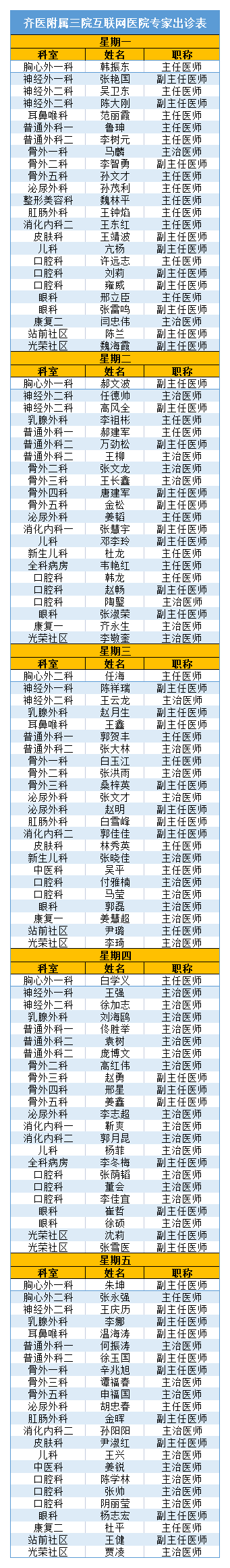 以下是齐医附属三院互联网医院新增科室专家视频问诊出诊表: