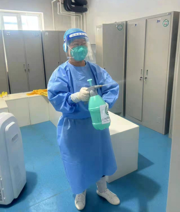 感控科孟晓琳在方舱医院对清洁区更衣室进行消杀