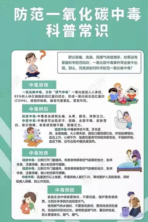 一氧化碳(co)是一种无色,无臭,无味,无刺激性的化学窒息性气体,当吸入后会引起血氧含量降低,出现中枢神经系统损害,并伴有不同程度的并发症。冬季是一氧化碳中毒的高发时期,在使用燃煤、炭火、天然气的同时,要保证安全,更要掌握一氧化碳的预防和施救常识,确保事故发生的同时,有能力进行自我保护人身安全。