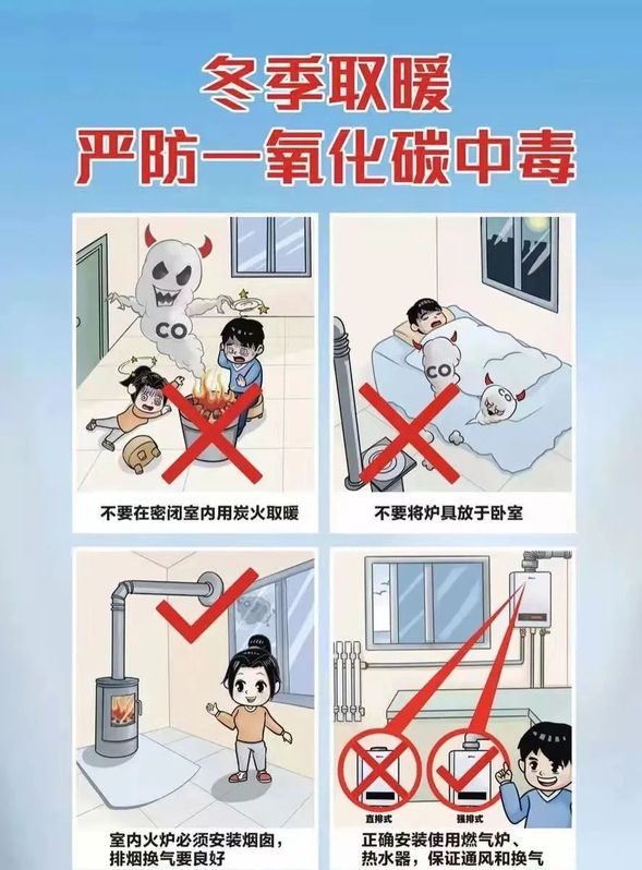 漫长冬季的到来,用煤炭取暖的住户,应保证室内排烟系统良好,门窗不要封闭过严,夜晚要摆放在室外。使用管道煤气时,要防止管道老化,跑气,漏气,烧煮时防止火焰扑灭,导致煤气溢出。不要在密闭的室内吃炭火锅,点炭火盆。在条件允许的情况下,在可能发生一氧化碳的区域安装烟雾报警器。