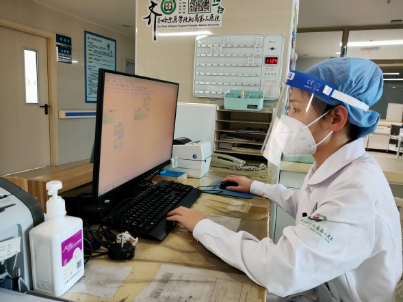 普外一科护士张春阳转阴后,第一时间投入到护理工作中,正在为病人查看病历。