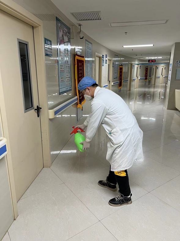 眼科医生董景超主动请缨,把3岁孩子留给家里老人照顾,自己已连续24小时3天在岗,图为董景超进行日常消毒。